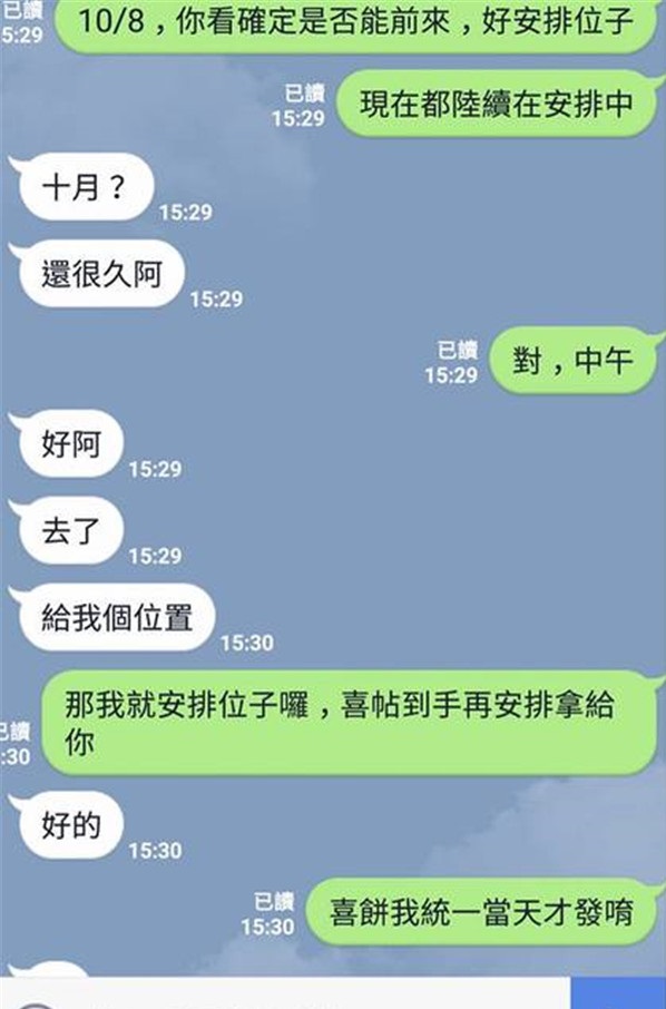 ▼從女網友分享的對話記錄截圖來看,她在第一次詢問對方是否能夠出席時,對方已經答應要去,還要女網友留個位子給她。