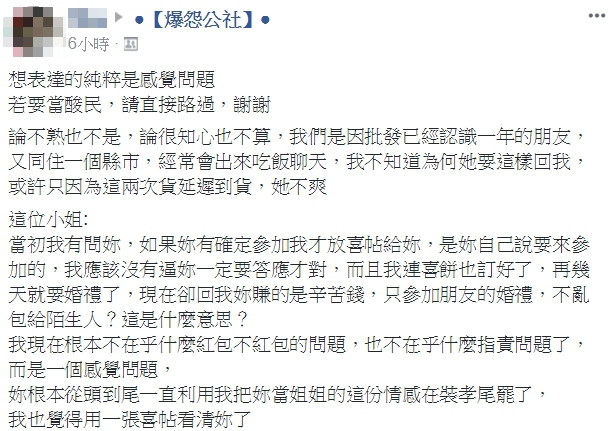 2017年09月28日結婚喜宴邀請朋友出席,本來是一件喜氣洋洋的開心事,不過如果因為發喜帖而導致兩個朋友之間的友誼破裂,那就有點可惜了。日前有一名女網友在臉書《爆怨公社》上抱怨,表示自己將喜帖發給一個做批發時認識的「姐姐輩」朋友,兩人平常交情不錯還經常一起吃飯聊天,沒想到對方在答應出席她的婚禮之後,不僅出爾反爾還口出惡言,女網友非常憤怒。