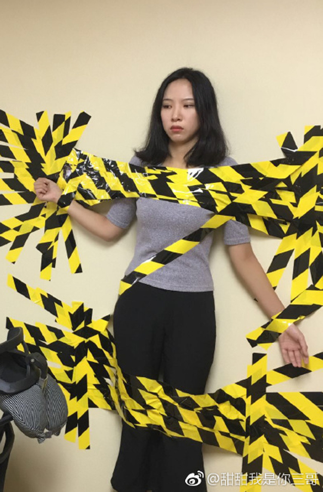前幾天,網友「甜甜我是你三哥」在「微博」發文,稱公司一名美女同事開車沒繫安全帶,被老闆發現後遭懲罰,被虐待用黑黃相間的膠帶黏在牆壁上。
