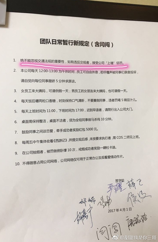 ▼這件事引起了網友們的關注,大家這才知道,那間公司的老闆是中國知名汽車評論員閆闖,他們公司日常規定的第一條,就是「絕不能忽視交通法規的重要性,如有違反交規者,接受公司『上牆』懲罰。」這項規定全公司的人都要遵守,連閆闖也不例外。