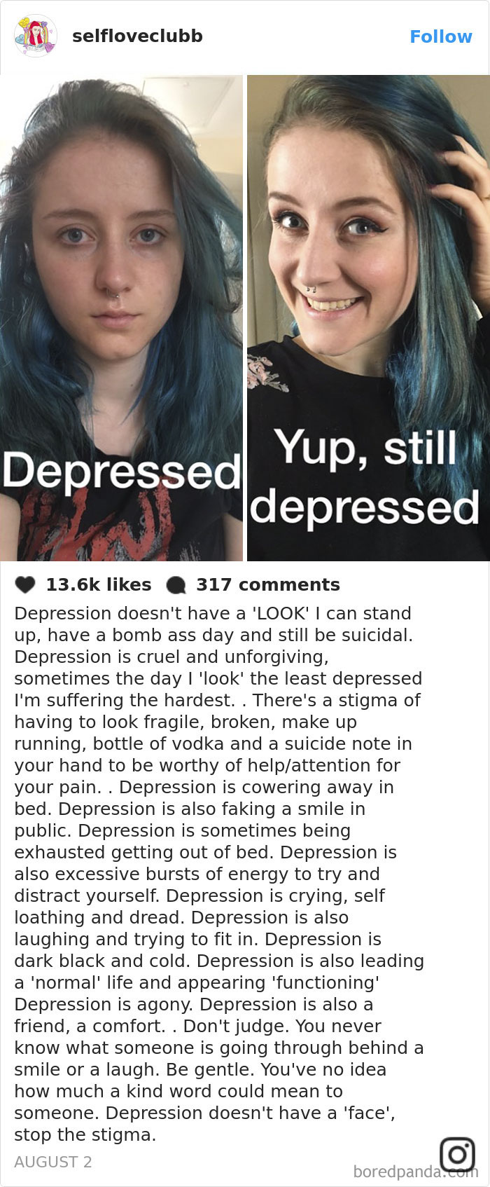 罹患憂鬱症、有自殺傾向的人是什麼樣的?在很多人看來,他們應該很悲慘,蓬頭垢面、脆弱不堪,隨時都可能崩潰。但事實並非如此。網友們在Ins上發起了一個叫「#faceofdepression」的話題,憂鬱症患者們分享了自己的經歷,他們的模樣與我們想像中截然不同。