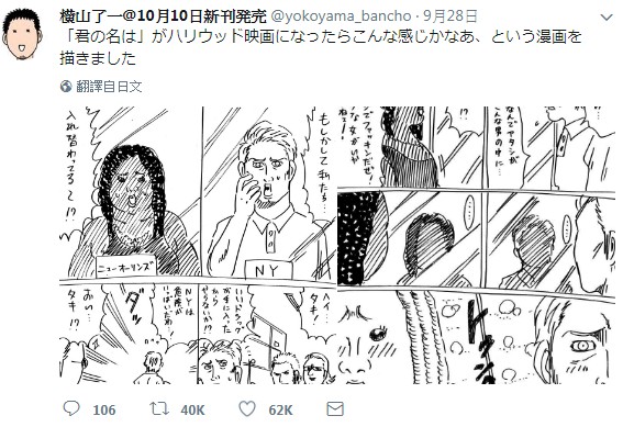 ▼一名日本漫畫家網友@yokoyama_bancho近日就在自己的推特上傳了他所「預測」的好萊塢真人版《你的名字》電影的劇情,超惡搞的劇情反而引起了網友的好評!他將片中男主角立花瀧畫成一位來自紐約的白人男子,而女主角宮水三葉則變成了一位來自紐奧良的黑人女子。一起來看看他所想出的劇本吧:
