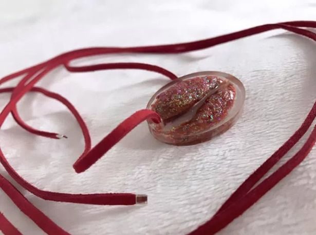 ▼最後將陰唇放入樹脂內,項鏈吊飾就這樣完成了。