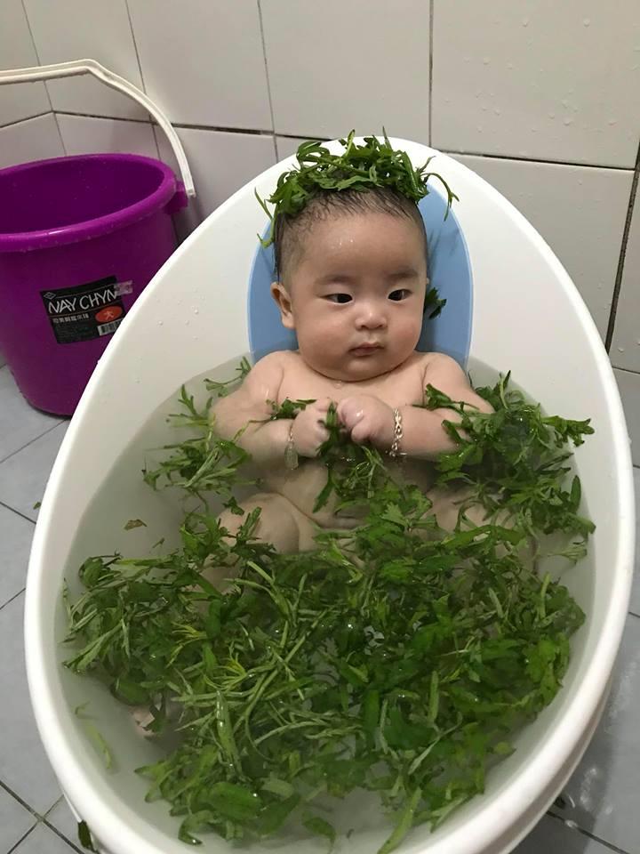 小肉圓乖巧躺在浴缸中,水面上漂著很多剪碎的艾草葉,他的頭頂也被媽媽放了「艾草葉冠」,看起來很可愛。媽媽忍不住笑說:「這艾草的量,說明了這小孩應該是非常灰噢。」