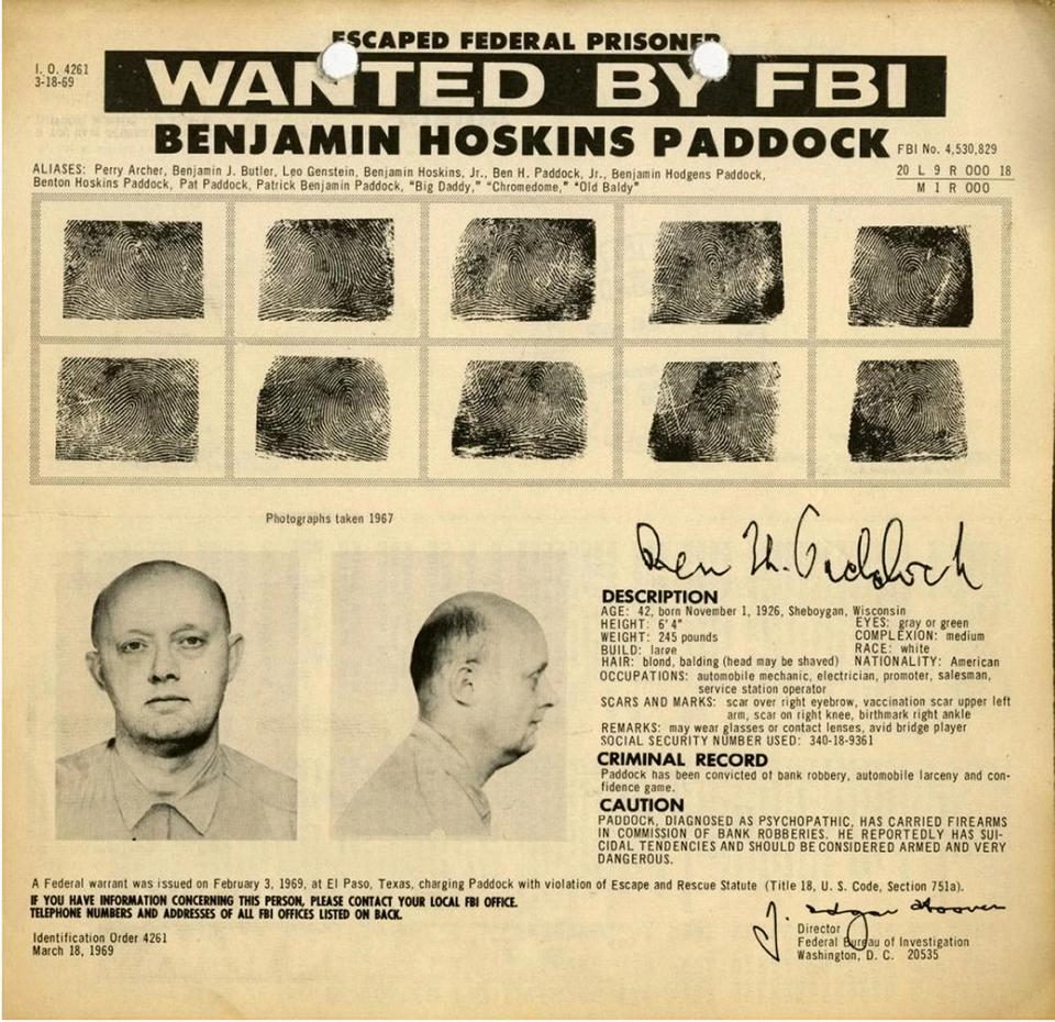 ▼不過日前有美國媒體發現史蒂芬的父親班傑明(Benjamin Hoskins Paddock)曾被美國聯邦調查局FBI列為10大通緝犯之一!原來班傑明於1960年在亞利桑那州因此多次搶劫銀行而被判刑20年。不過史蒂芬的母親當時盡全力隱瞞他這件事,不想讓史蒂芬知道自己的父親是銀行搶匪。