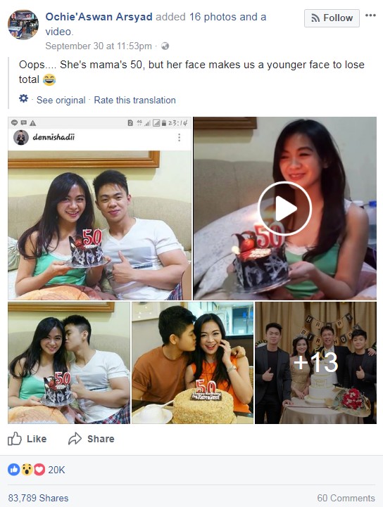 2017年10月06日一名印尼網友在臉書分享了一則看起來像情侶之間慶生的照片,可是如果你仔細一看,蛋糕上的年齡數字竟然寫著:50!原來這名女子是這位小鮮肉的母親,兩母子看起來年紀竟然相差無幾!