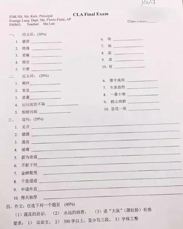 ▼就讀美國富蘭克林羅斯福高中(Franklin Delano Roosevelt High School)的學生都要選讀外語科目,其中一門就是中文,不過當大家看到他們高一的中文試卷時,都覺得這也太難了吧!