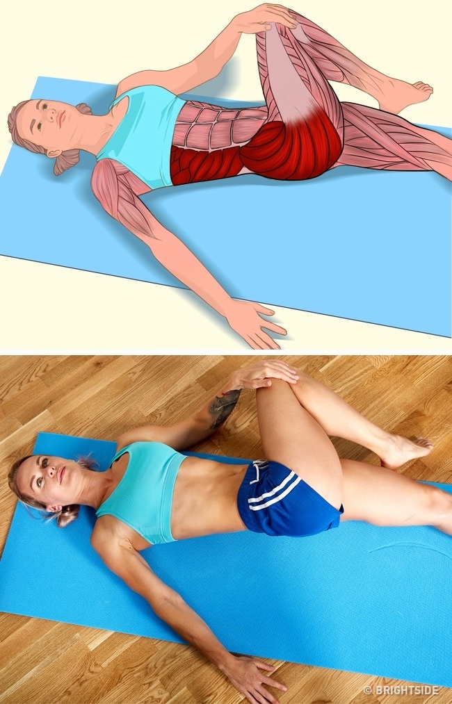 ▼​臀大肌和腹外斜肌:仰躺在地,彎曲右膝,將右腿歪向身體左側,用左手輕輕按壓。拉伸完畢後換另一條腿。