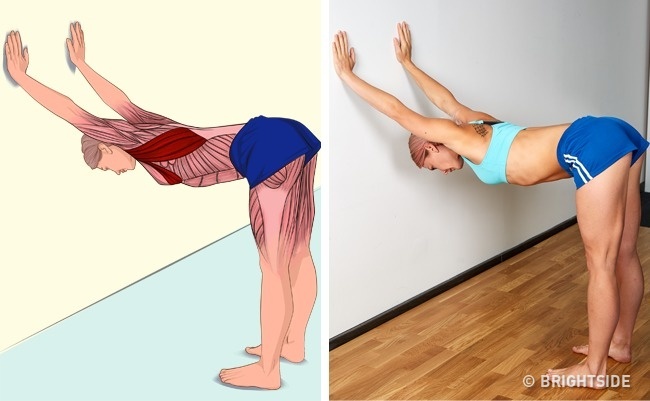 ▼​胸肌和背闊肌:在牆前站立,與牆壁保持半身的距離。彎腰後雙手支撐牆壁。