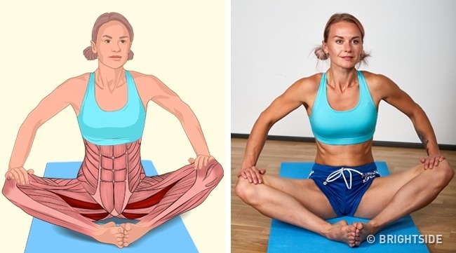 ▼​收肌群:後背挺直坐下,兩腳相對,盡量下壓膝蓋。