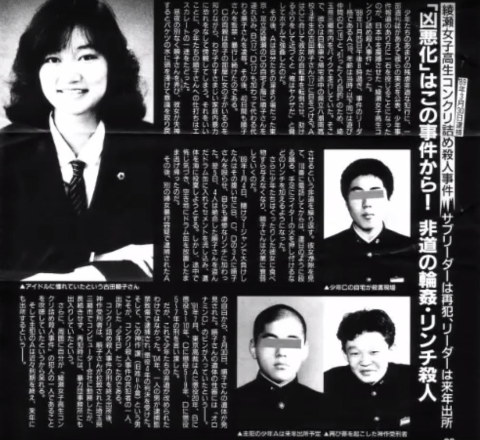 這起案件被披露時,4名男高中生大約為16到18歲。處於對未成年人的保護,很多報導都沒有揭露他們的訊息,但週刊卻將4人的全名、家庭背景都披露了出來。很多人覺得不妥,當時週刊總編輯花田紀凱卻說:「野獸是沒有人權可言的!」