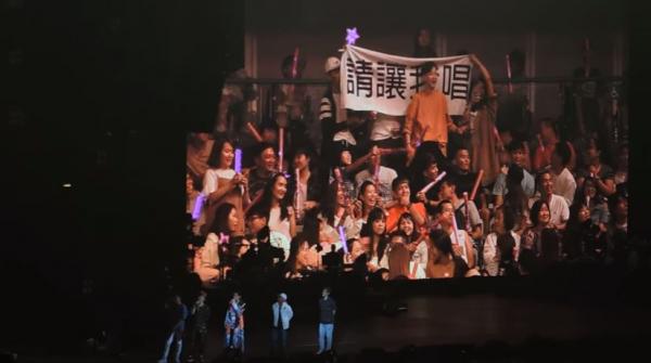▼這位在觀眾區舉著牌子高喊「請讓我唱」的粉絲真的被周杰倫點到,一起合唱經典的歌曲《退後》。