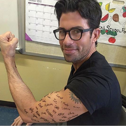 ▼Nicholas Ferroni:這麼帥的老師當然受歡迎。他向學生們保證,會把得到A的學生名字彩繪到手臂上,現在他實現了承諾。Nicholas小時後有很多夢想,比如當超級英雄、心理學家、哲學家、慈善家、演員……老師這份工作幫他實現了夢想。