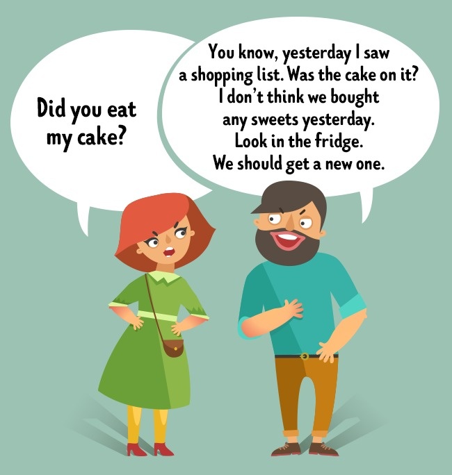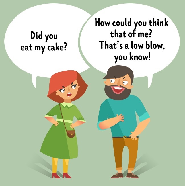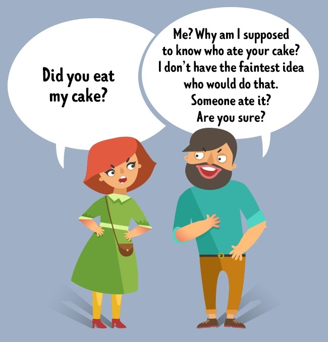 「你吃了我的蛋糕嗎?」「我?為什麼我要知道誰吃了你的蛋糕?我什麼都不知道。有人吃了你的蛋糕嗎?你確定?」