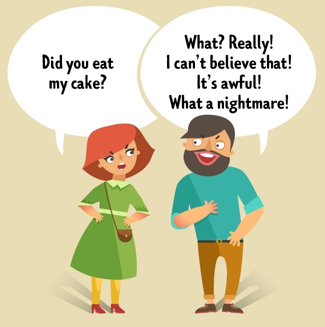 「你吃了我的蛋糕嗎?」「什麼?真的嗎?!難以置信!這太可惡了!真是噩夢!」