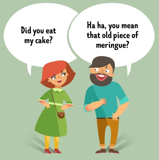 「你吃了我的蛋糕嗎?」、「哈哈,你是說那塊放了好久的蛋白霜嗎?」