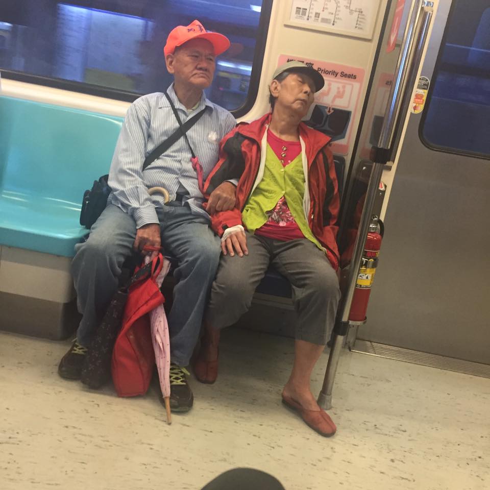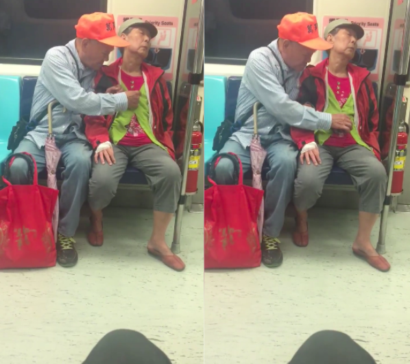 前幾天,網友Chung Wei Lei搭捷運時看到了超暖心的一幕。他在亞東醫院往南港方向的捷運上看到了一對老夫妻。老奶奶好像很累,頭靠著後方的車廂睡了過去,車上的風有點大,老爺爺可能怕妻子著涼,就用輕微顫抖的手慢慢幫妻子扣上了背心的釦子。