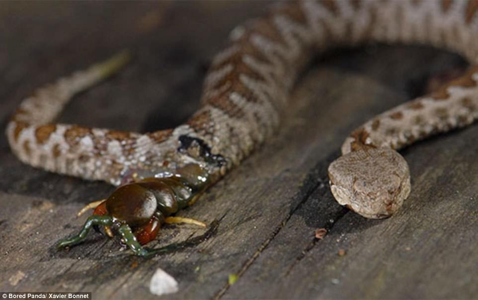 ▼蜈蚣被毒蛇吞吃,然後破腹而出。