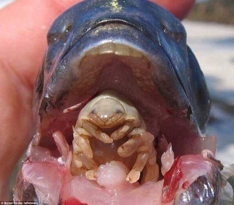 ▼縮頭魚虱是魚嘴巴裡的寄生蟲,牠們會讓魚的舌頭萎縮掉落,然後自己取而代之,不過不會對魚造成別的損害。