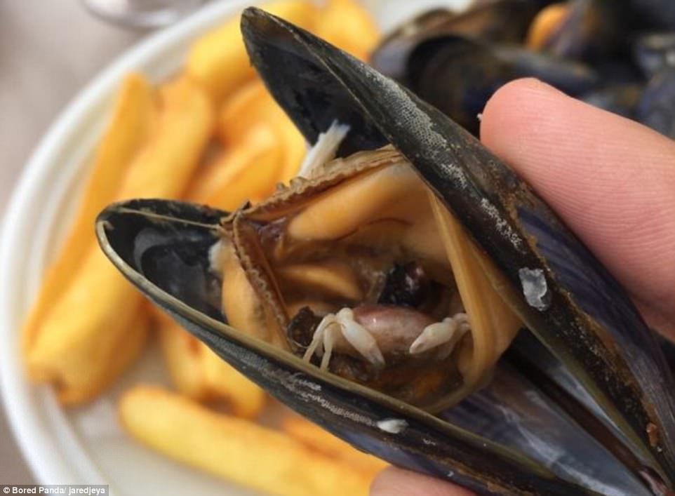 ▼這隻貽貝嘴巴裡有一隻小螃蟹。