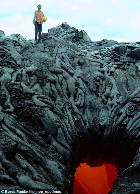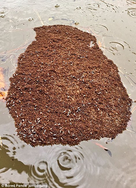 ▼洪水中火蟻聚集起來漂浮在水面;火山坑周圍的熔岩就像燒焦的屍體。