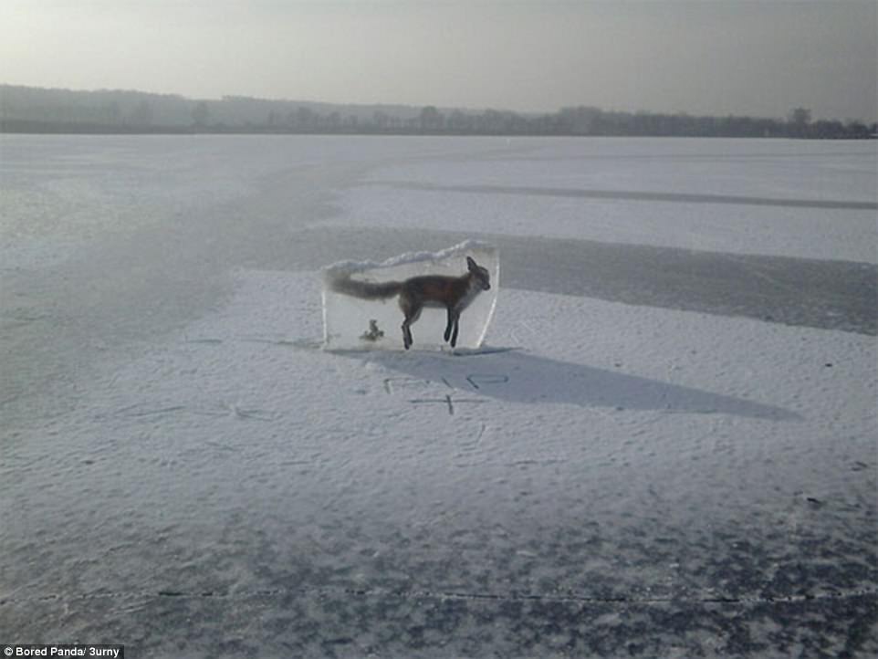 ▼狐狸掉入冰湖被凍成冰雕,人們將牠挖出來擺在那裡,警告大家不要隨便到冰面上玩。