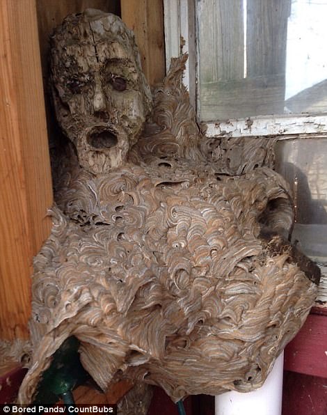 ▼黃蜂在雕塑上築巢;寄生蟹轉到了娃娃頭裡。