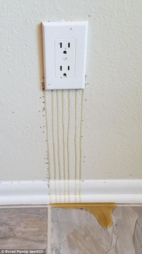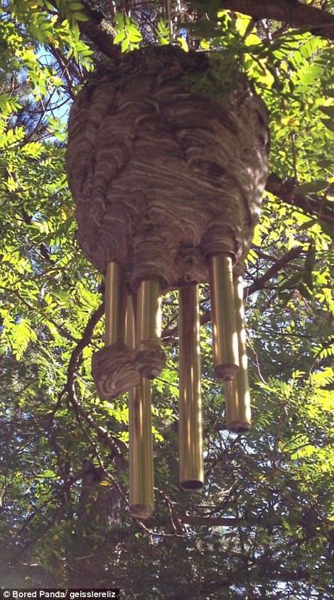 ▼蜜蜂在風鈴上築巢;牆內有蜜蜂築巢,蜂蜜都流出來了。
