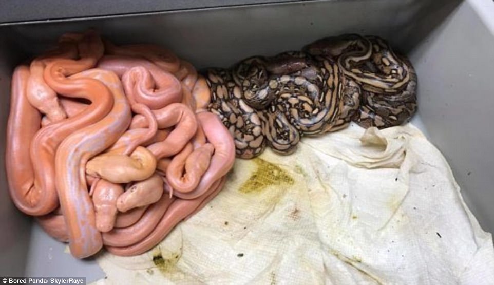 ▼剛剛孵化出來的蟒蛇會自己根據顏色分開。