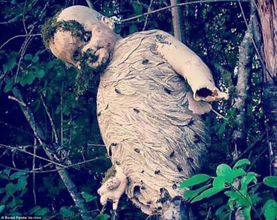 ▼一群黃蜂在被丟棄的娃娃體內築巢。