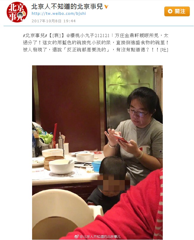 ▼原來這名網友日前到北京的金鼎軒用餐,發現餐廳中有一位媽媽竟然用餐廳提供的碗來給自己的小孩接尿,之後還將尿倒進其他裝食物的碗裡。