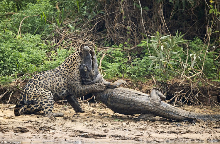 ▼在岸上美洲虎依然氣質洶湧,不斷的撕咬凱門鄂的喉嚨。
