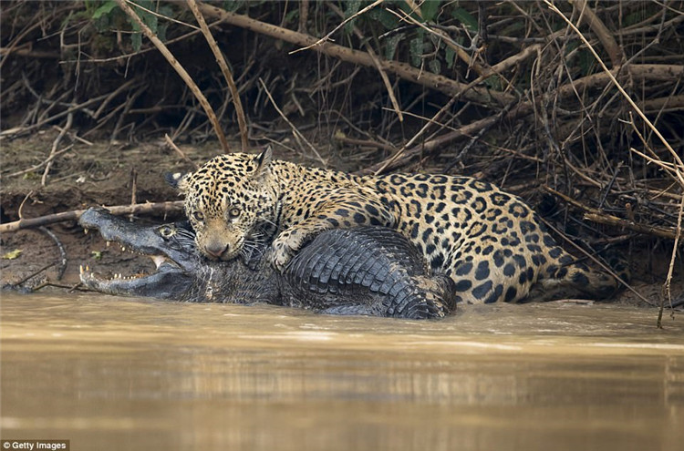▼美洲虎開始伏擊在河岸邊,然後伺機一下咬住了凱門鄂的脖子。