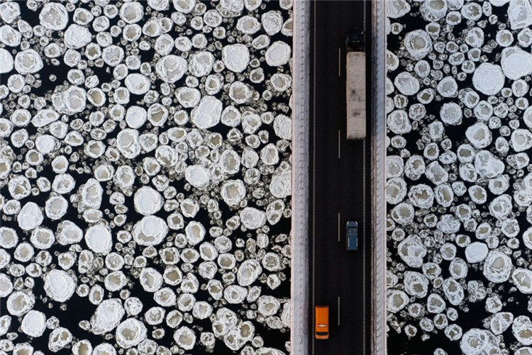 ▼一條結冰的河上的一座橋