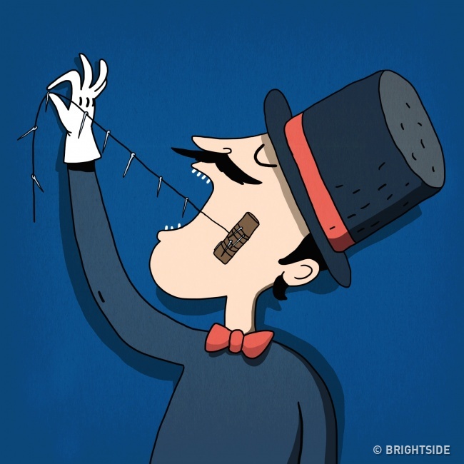 表演:魔術師吞下線和50個針,張開嘴巴讓觀眾檢查,然後他從嘴巴裡拉出來一根帶有50個針的線。