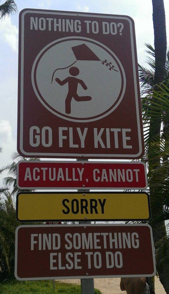 ▼這個告示牌真的很有趣:「沒事做?去玩個風箏吧!事實上,不行,很抱歉,找些別的事情來做吧。」