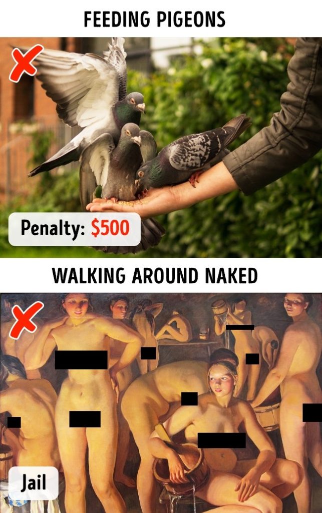 ▼如果你喂鴿子將會被罰款500新元(約新台幣1萬1千元),裸體走動(在家也不行)將會被判入獄。