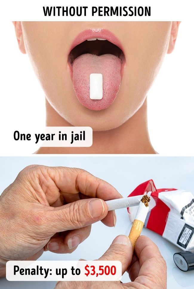 ▼你想要吃口香糖必須得到醫生所開的處方,不然將會被判刑一年;如果沒有特別許可證在手提箱內攜帶香菸,會被罰款罰款3500新元(約新台幣7萬8千元)。