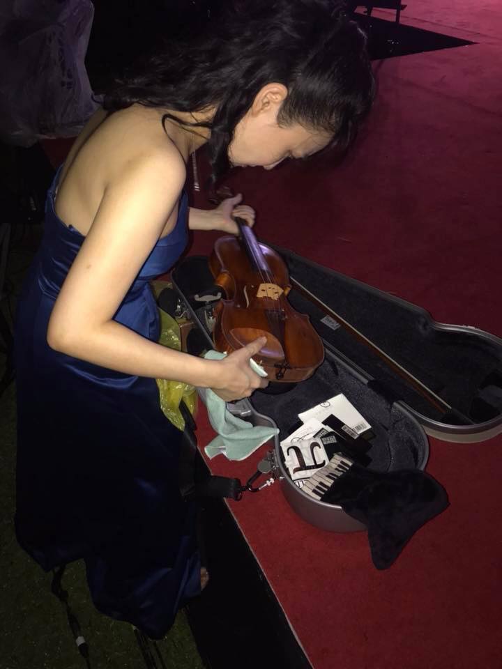 ▼美女小提琴家馮楚軒在台東國慶音樂會擔任首席和獨奏,但主辦單位卻沒有準備「雨天備案」,害樂器承受日曬雨淋,她事後在個人臉書抒發說:「演奏到一半突然下超大雨,忍了演奏兩面,為了保護大家的樂器,只好當機立斷曲子沒演完率先離席!我知道上了電視,很無奈,但實在太誇張了!樂器是不能曬太陽和淋雨,而短短7小時我們樂器被狂曬和狂淋,如果我再慢一點災情會更慘!」