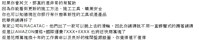 ▼至於英文,他認為能夠看懂最新的施工方法、工具、安全宣導,還有瞭解到有什麼革命性的新發明或產品,對工作非常有幫助。
