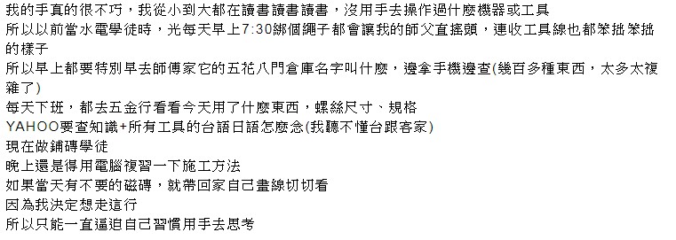 ▼他表示因為已經決定要走這行,因此只能用各種方法逼迫自己習慣用手去思考,同時會瞭解各種工具的名詞,和到五金行學校各種尺寸和規格,還會上網查所有工具的日語和台語的唸法。