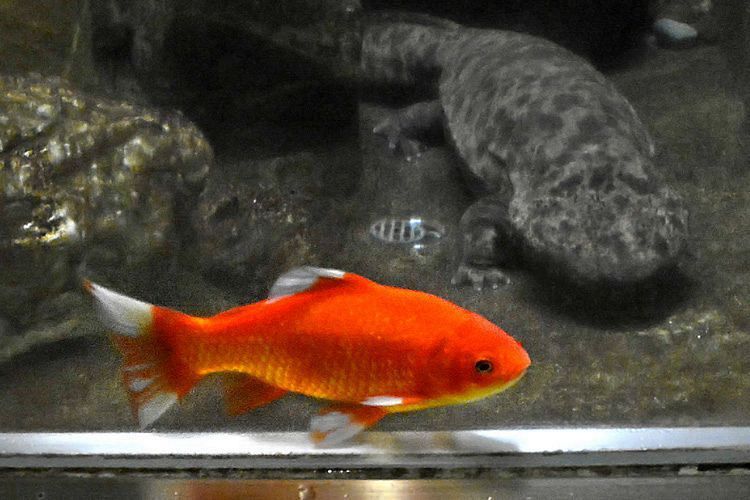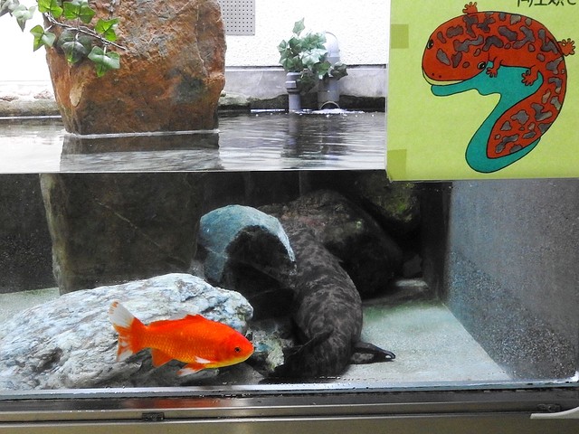 ▼今年夏天,28歲的山椒魚壽終正寢,鯉魚君成為了池子的主人。牠已經長到30公分,看起來很霸氣。工作人員很佩服牠,讓牠成為了這個展示區的主角。水槽原本設定的溫度為15度,適合山椒魚生存,現在變成了適合金魚生存的22度,動物園還放了好幾隻小金魚進去陪伴鯉魚君。
