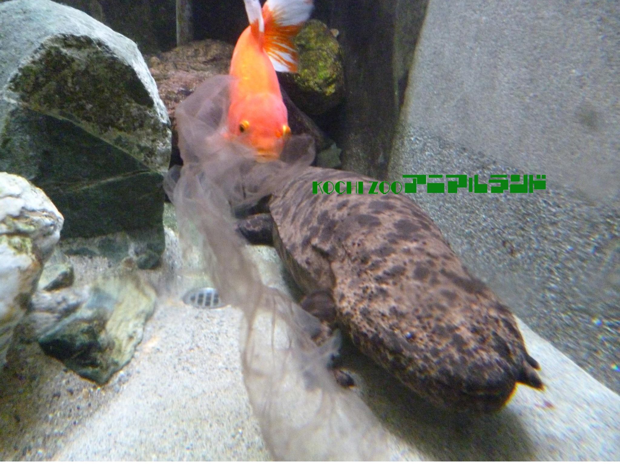 ▼動物園沒有為鯉魚君準備食物,牠就吃山椒魚脫下來的皮過活。看到的人笑說:「鯉魚君根本就是在幫山椒魚脫皮。」