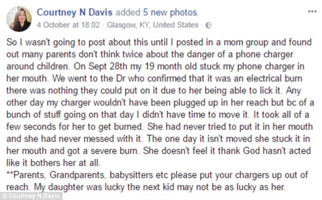 ▼來自美國肯塔基州的戴維斯日前在臉書呼籲大家,看到小孩碰觸手機充電器時,千萬要阻止他們,尤其是他們想將充電器放進嘴巴裡時。