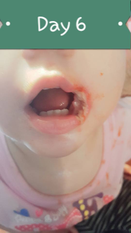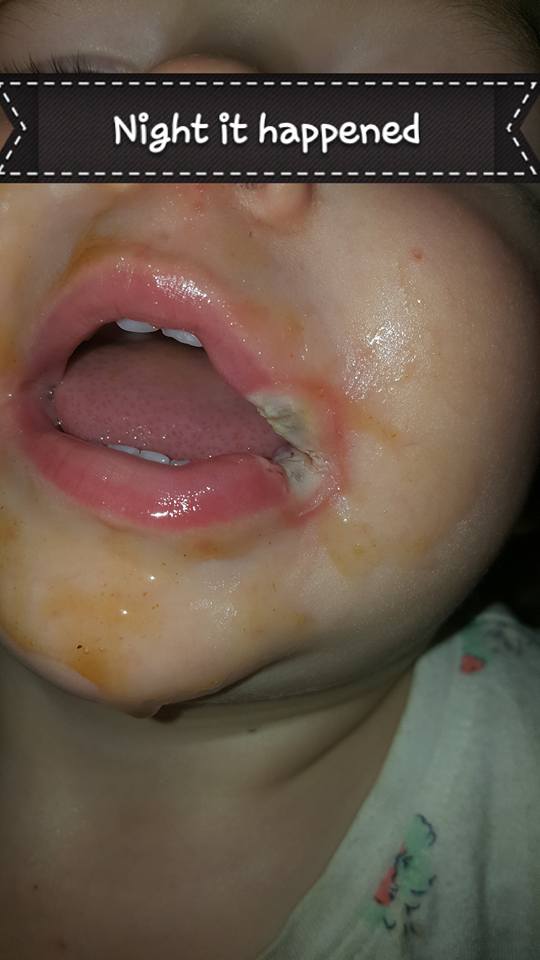 ▼戴維斯將女兒嘴角傷口的傷勢拍照記錄下來,以此警惕其他的父母千萬要小心。這是隔天起床之後的傷口: