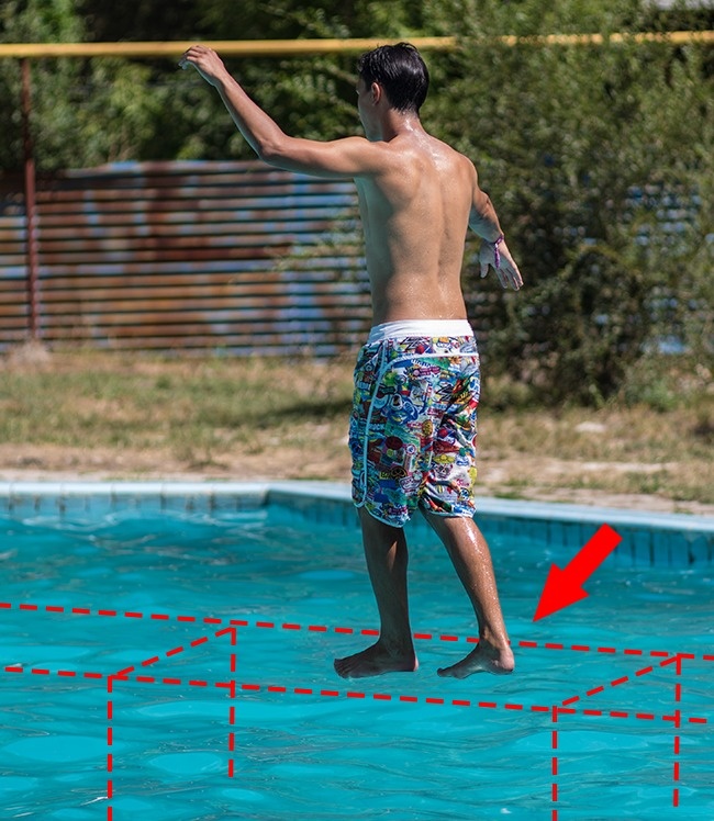 ▼水上行走:這種魔術只能在水質不清的地點,或者人造泳池進行。魔術師會在水中放透明的平台,然後行走。