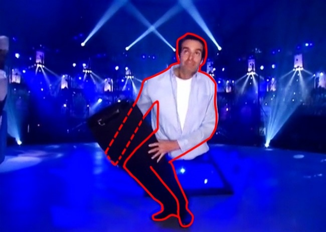 ▼把身體切成兩半:這個魔術只能從前面觀賞,因為從側面看會看出破綻。從膝蓋到腰部是塑膠假人,魔術師穿著寬鬆的衣服,用特定的姿勢,創造出了一種身體分開的錯覺。