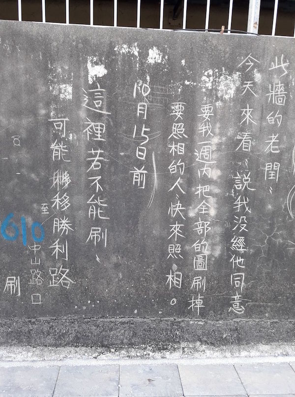 ▼老闆認為黃聖人沒有知會他就在牆上作畫,非常不尊重,加上這個區段車流多,可能因為圍觀拍照引發事故,決定報警處理,並把這些佛像抹除。黃聖人則歉疚說,他當時路過這片外牆,希望黑壓壓的牆面能有些變化,才會畫下佛像,「真的沒有惡意,只希望街容變得更好看。」
