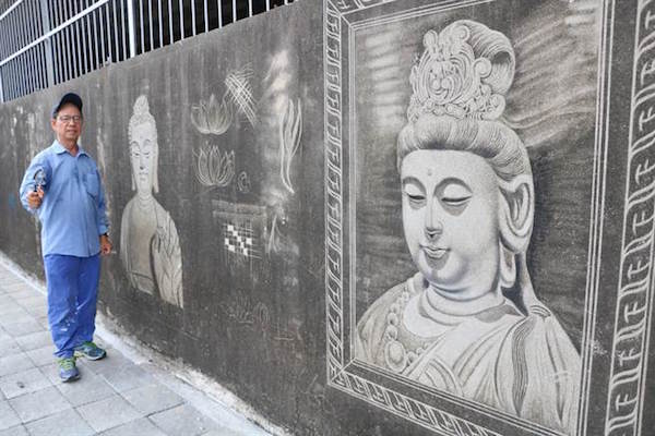 ▼黃聖人在郵差退休後就成為鋼刷藝術家,在全國留下約400多幅牆面創作。今年7月他在屏東一家鏈條工廠外牆作畫,留下8幅佛像作品,意外成為網友熱門拍照景點,卻招來老闆不滿。
