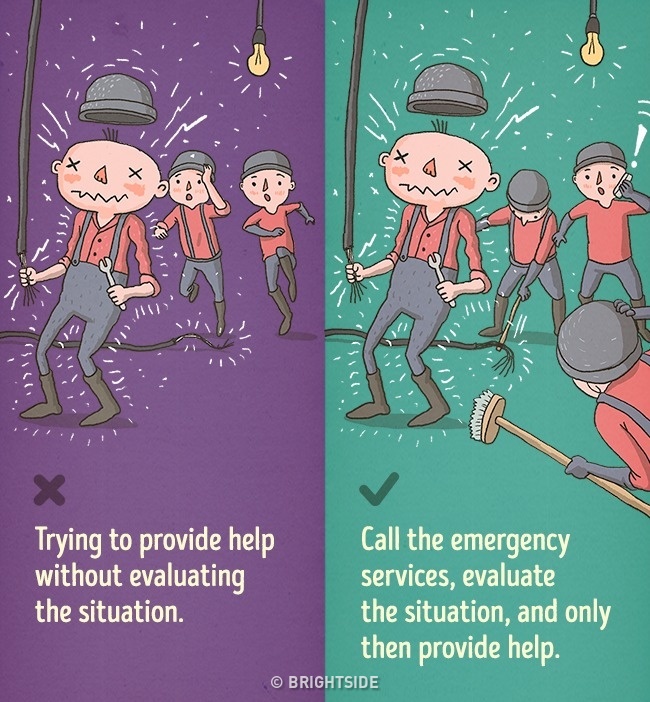 ▼救人前考慮一下:熱心救人是好事,但太魯莽的話,非但不能救人,自己還會受傷。確保自己不會受傷再救人。比如有人觸電,就用木頭、橡膠將對方與電源分離,而不是過去幫忙。